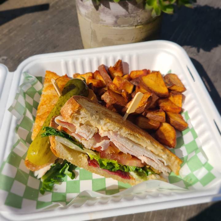 House smoked Rossdown organic turkey, Hopcotts beef bacon, artisan greens, vine ripened tomatoes, Dijion aioli, served on organic bread and with your choice of side.