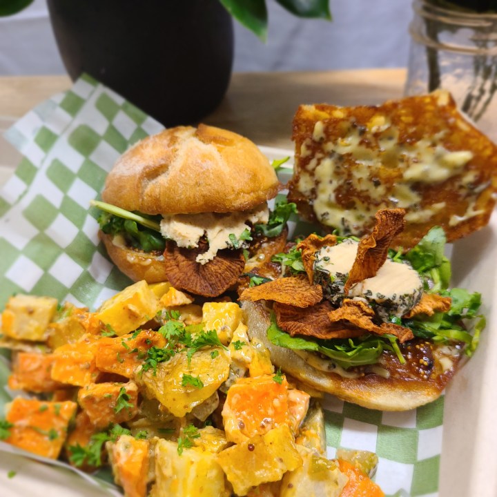 $17 Vegan Prosciutto Sliders. comes with our house-made potato salad
